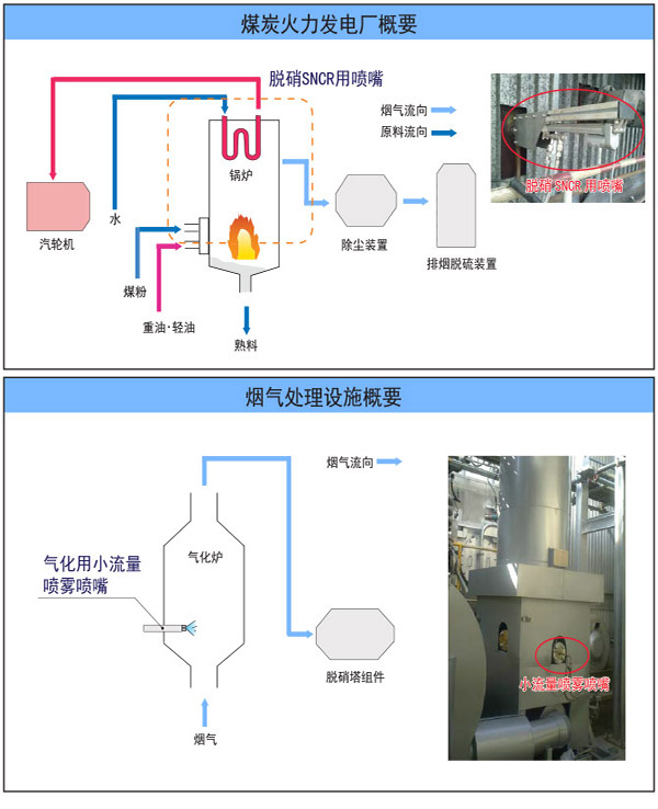 鍋爐內(nèi)燃燒時產(chǎn)生氮氧化物(NOx)等煙氣,使用噴嘴向煙氣中噴射氨水(NH3)。無觸媒脫硝法(SNCR)和觸媒脫硝法(SCR)都是通過使用壓縮空氣的二流體噴嘴,將平均粒子徑變小從而起到有效的化學(xué)反應(yīng)。