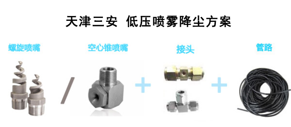低壓噴霧除塵系統(tǒng)是由螺旋噴嘴或者是空心錐噴嘴(旋流噴嘴),搭配接頭和管路組成,如果是螺牙連接,直接選擇合適尺寸大小的噴嘴就可以直接連接。