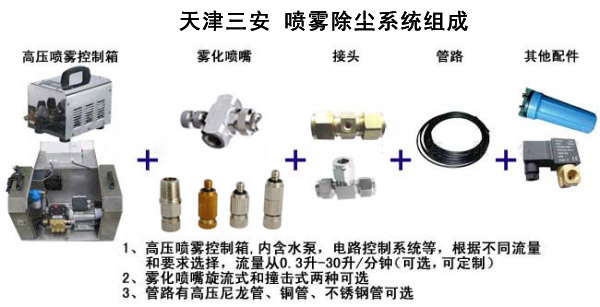 高壓噴霧除塵系統(tǒng)組成是由:凈水過濾設備 + 高壓噴霧控制箱(主機) + 高壓泵組 + 精細霧化噴嘴 + 接頭 + 管路 + 其他配件組合而成。