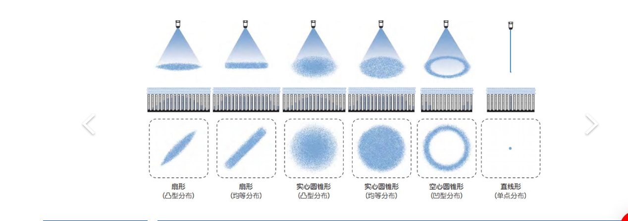 噴嘴的噴霧形式有:扁平扇形、實(shí)心錐圓形、空心錐圓形、液柱流